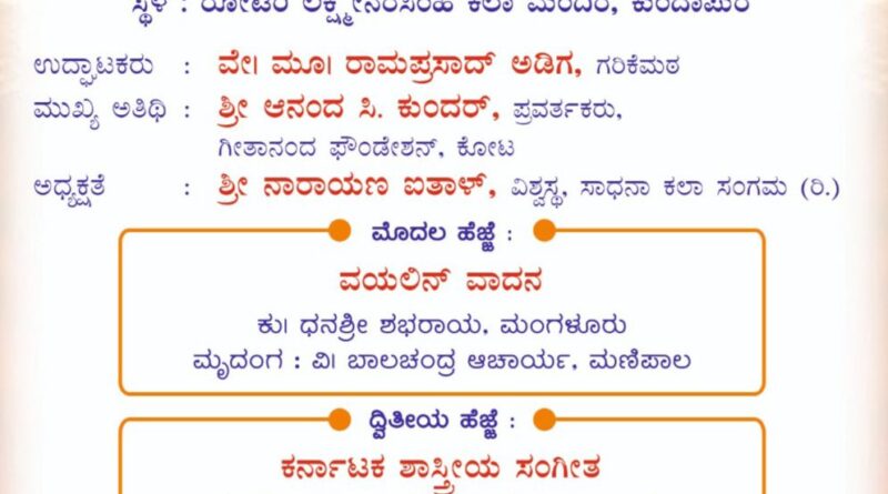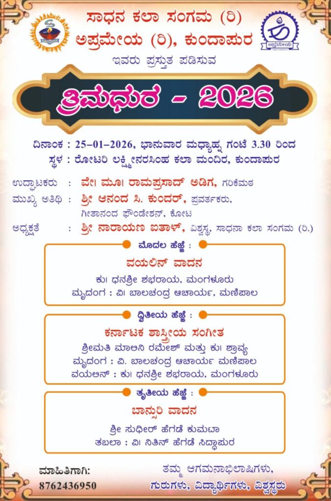 ಜನವರಿ 25: ಕುಂದಾಪುರದ ಸಾಧನ ಕಲಾ ಸಂಗಮ ಮತ್ತು ಅಪ್ರಮೇಯದಿಂದ ತ್ರಿಮಧುರ – 2026 ಕಾರ್ಯಕ್ರಮ