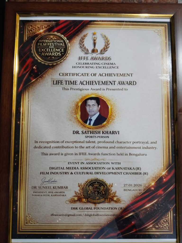 ಅಂತರರಾಷ್ಟ್ರೀಯ ಚಲನಚಿತ್ರೋತ್ಸವ ಮತ್ತು ಶ್ರೇಷ್ಠತೆ ಪ್ರಶಸ್ತಿಗಳು (IFEE Awards) -2026 ಕೊಡಮಾಡುತ್ತಿದ್ದು, ಸತೀಶ್ ಖಾರ್ವಿ ಅವರ ಸಾಧನೆಯನ್ನು ಗುರುತಿಸಿ ಈ ಪ್ರಶಸ್ತಿ ನೀಡಲಾಗಿದೆ.
