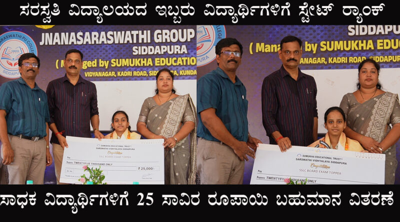 ಸಿದ್ದಾಪುರ: ಸರಸ್ವತಿ ವಿದ್ಯಾಲಯಕ್ಕೆ ಅತ್ಯುನ್ನತ ಗುಣಮಟ್ಟದ ಫಲಿತಾಂಶ, ಎರಡು ರ್ಯಾಂಕ್ – ಆಡಳಿತ ಮಂಡಳಿಯಿಂದ ಸನ್ಮಾನ
