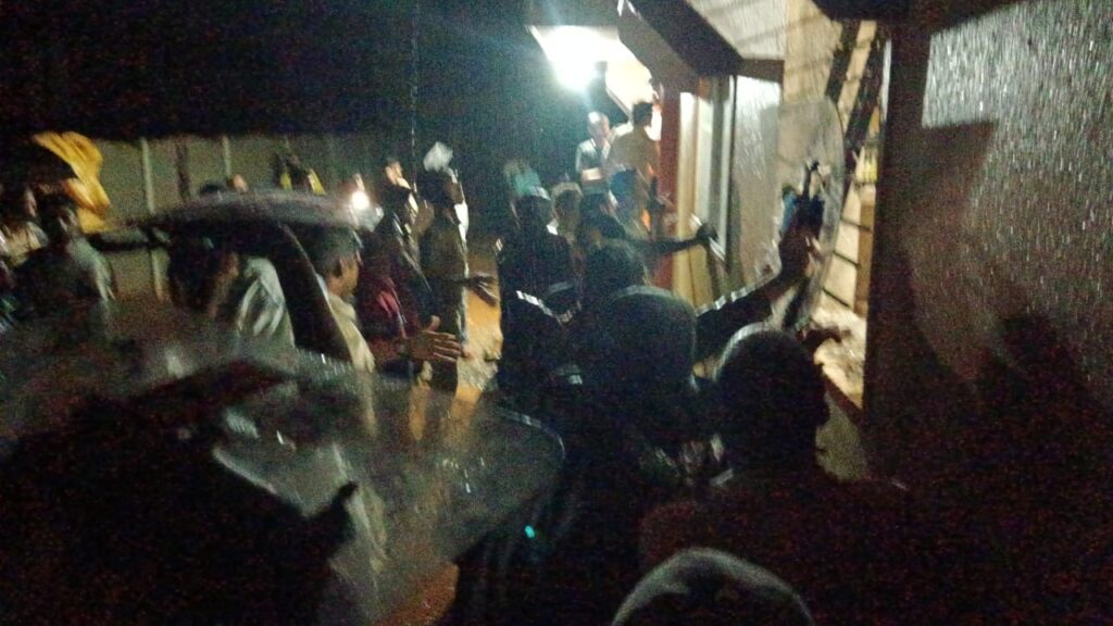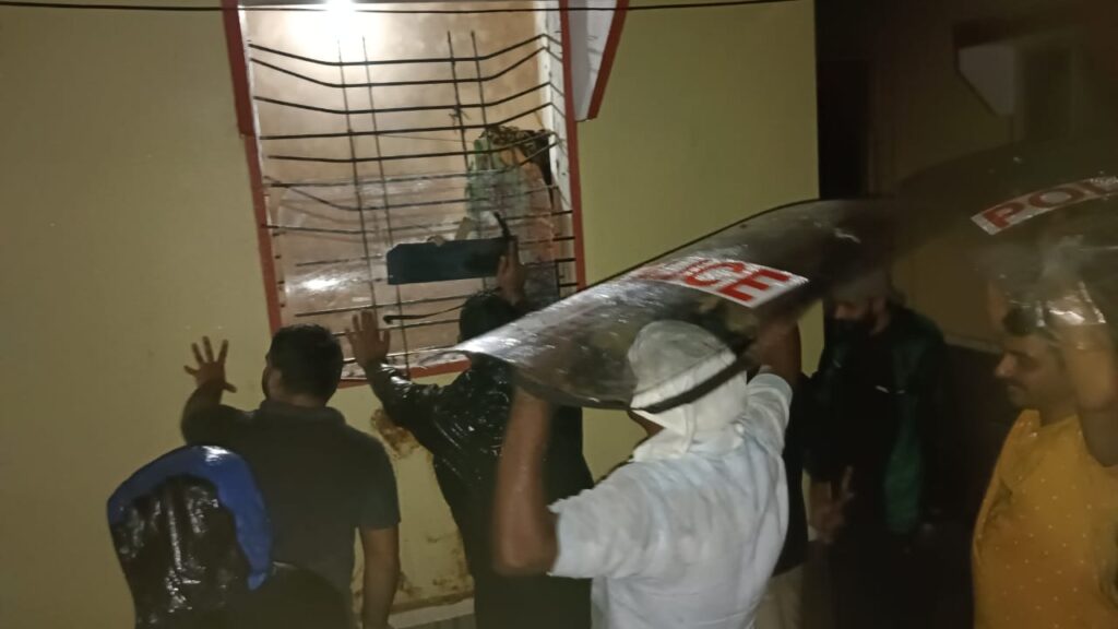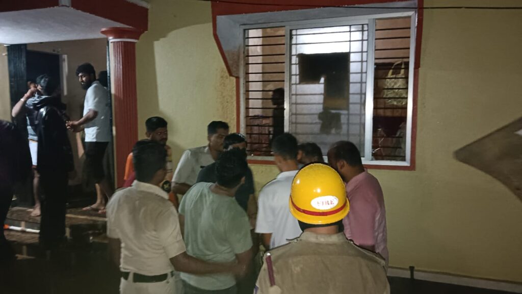 ಆದರೆ ಆರೋಪಿ ಮಾತ್ರ ದೆವ್ವ ಮೈಮೇಲೆ ಬಂದವನಂತೆ ಕತ್ತಿ ಹಿಡಿದು ಕುಣಿಯುತ್ತಿದ್ದ. ತಕ್ಷಣ ಪೊಲೀಸರಿಗೆ ಮಾಹಿತಿ ನೀಡಿದ್ದು, ಪೊಲೀಸರು ಹಾಗೂ ಅಗ್ನಿಶಾಮಕ ದಳದ ಸಿಬ್ಬಂದಿಗಳು ಸ್ಥಳಕ್ಕೆ ಬಂದು ಮನೆಯೊಳಗೆ ಅಶ್ರುವಾಯು ಪ್ರಯೋಗಿಸಿದರೂ ಕತ್ತಿ ಬೀಸುತ್ತಲೇ ಇದ್ದ ಆರೋಪಿ ಮಾತ್ರ ಹೊರಬರಲಿಲ್ಲ.