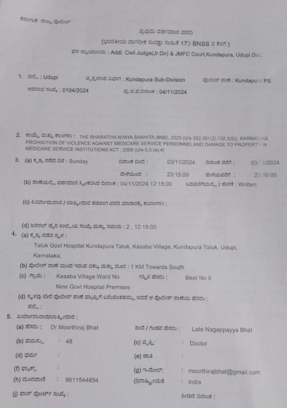 ಕುಂದಾಪುರ ತಾಲೂಕು ಸಾರ್ವಜನಿಕ ಆಸ್ಪತ್ರೆಯಲ್ಲಿ ನವಂಬರ್ 3ರಂದು ರಾತ್ರಿ ಘಟನೆ ನಡೆದಿದ್ದು, ಕರ್ತವ್ಯದಲ್ಲಿದ್ದ ಡಾ. ಮೂರ್ತಿರಾಜ್ ಎಂಬುವರು ದೂರು ನೀಡಿದವರು. ಆರೋಗ್ಯ ತಪಾಸಣೆಗೆ ಬಂದಿದ್ದ ರಾಧ ಅವರ ಪತಿ ನಾಗರಾಜ ಗಾಣಿಗ ಹಾಗೂ ಜೊತೆಗಿದ್ದ ಮಹಿಳೆ ಆರೋಪಿತರು.