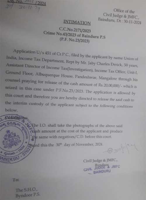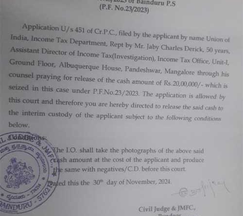 ಆದಾಯ ತೆರಿಗೆ ಇಲಾಖೆ ದಾಖಲಿಸಿದ್ದ ಪ್ರಕರಣದಲ್ಲಿ ಬೈಂದೂರು ಪೊಲೀಸರು ನಗದು ಜಪ್ತಿ ಮಾಡಿದ್ದಾರೆ. ಸಿಆರ್ಪಿಸಿಯ ಸೆಕ್ಷನ್ 451 ರ ಅಡಿಯಲ್ಲಿ ಯೂನಿಯನ್ ಆಫ್ ಇಂಡಿಯಾ ಸಲ್ಲಿಸಿದ ಅರ್ಜಿಯನ್ನು ಅನುಸರಿಸಿ ನ್ಯಾಯಾಲಯವು ಈ ಆದೇಶವನ್ನು ನೀಡಿದೆ, ಆದಾಯ ತೆರಿಗೆಯ ಸಹಾಯಕ ನಿರ್ದೇಶಕ (ತನಿಖೆ) ಜೇಬಿ ಚಾರ್ಲ್ಸ್ ಡೆರಿಕ್, (50), ಆದಾಯ ತೆರಿಗೆ ಕಚೇರಿ, ಪಾಂಡೇಶ್ವರ, ಮಂಗಳೂರು. ವಶಪಡಿಸಿಕೊಂಡ ನಗದನ್ನು ಆದಾಯ ತೆರಿಗೆ ಇಲಾಖೆ ಕಸ್ಟಡಿಗೆ ಮಧ್ಯಂತರ ಬಿಡುಗಡೆ ಮಾಡುವಂತೆ ಅರ್ಜಿಯಲ್ಲಿ ಕೋರಲಾಗಿತ್ತು.