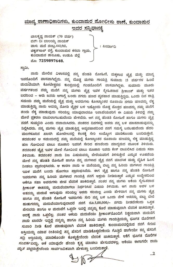 ಈಗ ಚೈತ್ರ ಹಾಗೂ ನನ್ನ ಹೆಂಡತಿ ರೋಹಿಣಿ ಇವರುಗಳು ನನ್ನ ಹಿರಿಯ ಮಗಳಾದ ಗಾಯತ್ರಿ ನನಗೆ ಆಶ್ರಯ ನೀಡಿರುತ್ತಾಳೆ ಎನ್ನುವ ಉದ್ದೇಶದಿಂದ ಆಕೆಗೂ ಸಹಾ ಅವರುಗಳು ಜೀವ ಬೆದರಿಕೆ ಹಾಕಿರುತ್ತಾರೆ. ನಂತರ ನನ್ನ ಮಗಳು ಆಕೆಯ ಸ್ನೇಹಿತನಾದ ಶ್ರೀಕಾಂತ್ ಈತನನ್ನು ಮದುವೆಯಾಗಲು ನಿರ್ಧರಿಸಿದ ವಿಷಯ ತಿಳಿಯಿತು. ಆಗ ನಾನು ಅವಳ ಬಳಿ ಆತನನ್ನು ಮದುವೆ ಆಗುವುದು ಸರಿಯಲ್ಲ ಆತನು ಸರಿಯಿಲ್ಲ ಎಂದು ಹೇಳಿದಾಗ ನನ್ನ ಮಗಳು ಚೈತ್ರ ಹಾಗೂ ನನ್ನ ಹೆಂಡತಿ ರೋಹಿಣಿ ಇವರುಗಳು ಸೇರಿ ನನ್ನ ಬಳಿ ಒಂದು ವೇಳೆ ಆತನನ್ನು ಬಿಟ್ಟು ಬೇರೆ ಹುಡುಗನನ್ನು ಮದುವೆಯಾಗುವುದಾದರೆ ನನಗೆ ರೂ.5,00,000/- (ಐದು ಲಕ್ಷ) ನಗದು ನೀಡಬೇಕೆಂದು ಒತ್ತಡ ಹೇರಿದರು ಹಾಗೂ ಆ ಮದುವೆಗೆ ಒಪ್ಪದೇ ಇದ್ದಲ್ಲಿ ನನ್ನನ್ನು ಕೊಲೆ ಮಾಡುವುದಾಗಿ ಬೆದರಿಕೆ ಹಾಕಿರುತ್ತಾಳೆ. ಅದಕ್ಕೆ ನಾನು ಒಪ್ಪಲಿಲ್ಲ. ನಂತರ ಆಕೆಯ ಮದುವೆಯು ಶ್ರೀಕಾಂತ್ ನೊಂದಿಗೆ ನಿಶ್ಚಯವಾಗಿ ಮದುವೆಗೆ ನಾನು ಬಾರದೇ ಇದ್ದಲ್ಲಿ ನನ್ನನ್ನು ಹಾಗೂ ನನ್ನ ಹಿರಿಯ ಮಗಳು ಗಾಯತ್ರಿಯನ್ನು ಭೂಗತ ದೊರೆಗಳಿಗೆ ಸುಪಾರಿ ನೀಡಿ ಕೊಲೆ ಮಾಡುವುದಾಗಿ ಬೆದರಿಕೆ ಹಾಕಿರುತ್ತಾಳೆ. ಕುಂದಾಪುರದಲ್ಲಿರುವ ನನಗೆ ಸೇರಿದ ಆಸ್ತಿಯನ್ನು ಯಾವ ರೀತಿಯಲ್ಲಿ ತನ್ನ ಹೆಸರಿಗೆ ಮಾಡಿಕೊಳ್ಳಬೇಕೆಂದು ಗೊತ್ತಿದೆ. ಹಾಗೆಯೇ ತನ್ನ ಹೆಸರಿಗೆ ಸದ್ರಿ ಆಸ್ತಿಯನ್ನು ಮಾಡಿಕೊಂಡೇ ಕೊಳ್ಳುತ್ತೇನೆಂದು ಬೆದರಿಕೆ ಹಾಕಿರುತ್ತಾಳೆ. ಆಕೆಗೆ ಭೂಗತ ದೊರೆಗಳ ಸಂಪರ್ಕವಿದ್ದು, ಆಕೆ ಯಾವುದೇ ಹೇಯ ಕೃತ್ಯ ಮಾಡಲು ಹೇಸುವವಳಲ್ಲ. ಆಕೆಯು ಈಗಾಗಲೇ ನಾನು ಮೃತಪಟ್ಟಿರುತ್ತೇನೆಂದು ಸಾರ್ವಜನಿಕವಾಗಿ ಹೇಳುತ್ತಾ ಬಂದಿರುತ್ತಾಳೆ.