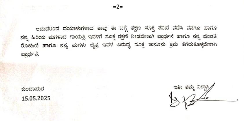 ಆದುದರಿಂದ ದಯಾಳುಗಳಾದ ತಾವು ಈ ಬಗ್ಗೆ ತಕ್ಷಣ ಸೂಕ್ತ ತನಿಖೆ ನಡೆಸಿ ನನಗೂ ಹಾಗೂ ನನ್ನ ಹಿರಿಯ ಮಗಳಾದ ಗಾಯತ್ರಿ ಇವಳಿಗೆ ಸೂಕ್ತ ರಕ್ಷಣೆ ನೀಡಬೇಕಾಗಿ ಪ್ರಾರ್ಥನೆ ಹಾಗೂ ನನ್ನ ಹೆಂಡತಿ ರೋಹಿಣಿ ಹಾಗೂ ನನ್ನ ಮಗಳು ಚೈತ್ರ ಇವಳ ವಿರುದ್ಧ ಸೂಕ್ತ ಕಾನೂನು ಕ್ರಮ ತೆಗೆದುಕೊಳ್ಳಬೇಕಾಗಿ ಪ್ರಾರ್ಥನೆ ಎಂಬುದಾಗಿ ದೂರಿನಲ್ಲಿ ತಿಳಿಸಿದ್ದಾರೆ. ಆದರೆ ಪೊಲೀಸರು ಮಾತ್ರ ಎಫೈಆರ್ ದಾಖಲಿಸದೇ ರಾಜೀ ಪಂಚಾಯಿತಿ ಸಂಧಾನ ನಡೆಸುತ್ತಿದ್ದಾರೆ ಎಂದು ತಿಳಿದು ಬಂದಿದೆ.