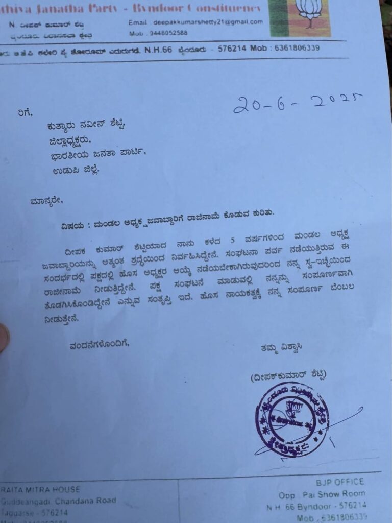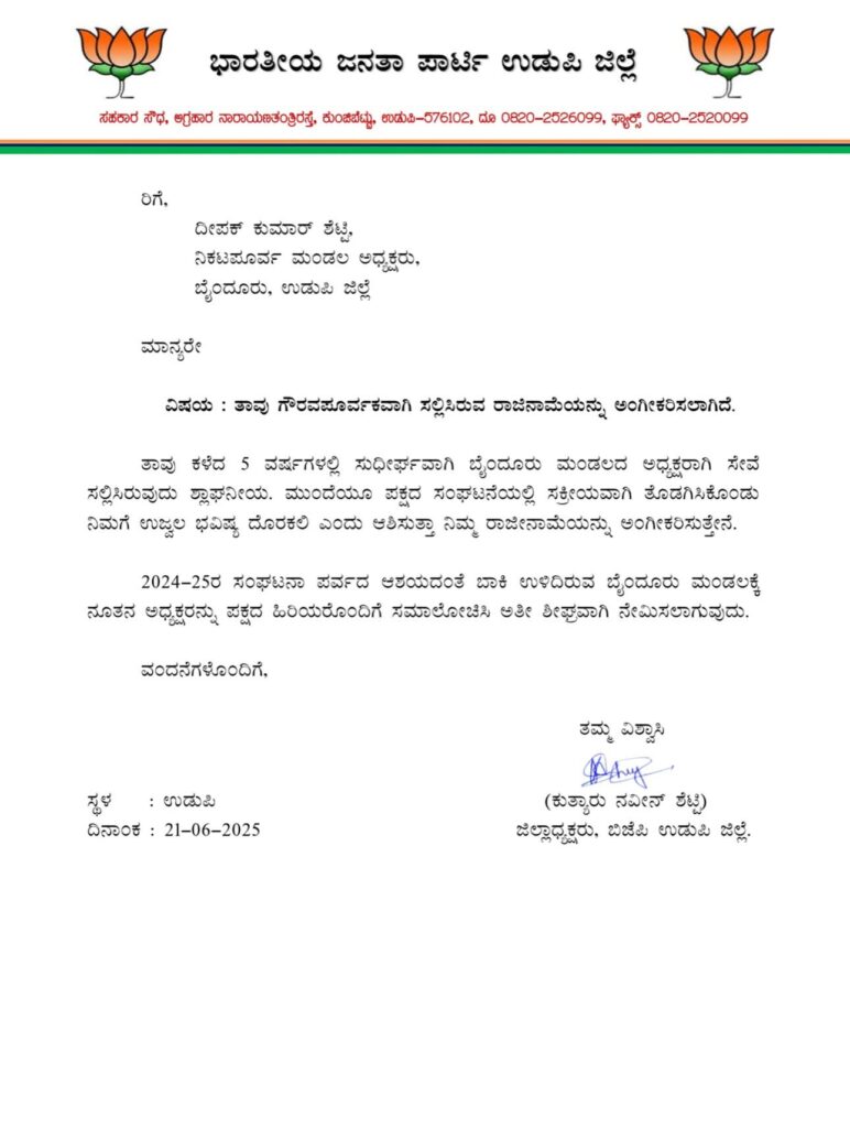 ಬೈಂದೂರು: ಬಿಜೆಪಿ ಅಧ್ಯಕ್ಷ ದೀಪಕ್ ಕುಮಾರ್ ಶೆಟ್ಟಿ ರಾಜೀನಾಮೆ – ಜಿಲ್ಲಾಧ್ಯಕ್ಷರಿಂದ ಅಂಗೀಕಾರ
