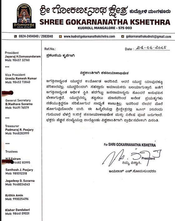 ಜೂನ್ 26: ಜಾಗತಿಕ ಯುದ್ಧ ಕಾರ್ಮೋಡ ತಪ್ಪಿಸಲು ಕುದ್ರೋಳಿ ಗೋಕರ್ಣನಾಥ ದೇವಸ್ಥಾನದಲ್ಲಿ ಶತಸಿಯಾಳಾಭಿಷೇಕ, ವಿಶೇಷ ಪೂಜೆ
