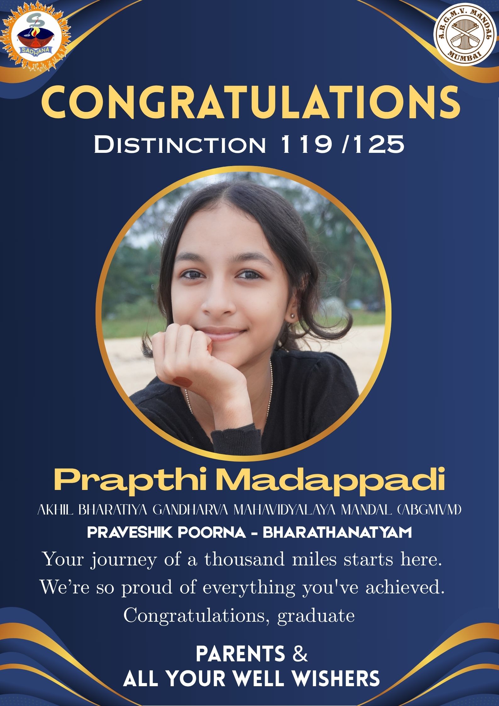ಭರತನಾಟ್ಯ ಪ್ರಾವೇಶಿಕ ಪೂರ್ಣ ವಿಭಾಗದಲ್ಲಿ ಪ್ರಾಪ್ತಿ ಮಡಪ್ಪಾಡಿ ಪ್ರಥಮ