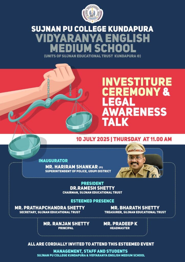 ಕುಂದಾಪುರ: ನಾಳೆ ಜುಲೈ 10ರಂದು ಸುಜ್ಞಾನ ಎಜ್ಯುಕೇಶನ್ ಟ್ರಸ್ಟ್ ನ ಸುಜ್ಞಾನ ಪದವಿ ಪೂರ್ವ ಕಾಲೇಜು ಹಾಗೂ ವಿದ್ಯಾರಣ್ಯ ಇಂಗ್ಲಿಷ್ ಮಾಧ್ಯಮ ಶಾಲೆಯಲ್ಲಿ ವಿದ್ಯಾರ್ಥಿ ಸಂಸತ್ತು ಪದಗ್ರಹಣ ಹಾಗೂ ಕಾನೂನು ಅರಿವು ಕಾರ್ಯಕ್ರಮ ನಡೆಯಲಿದೆ.