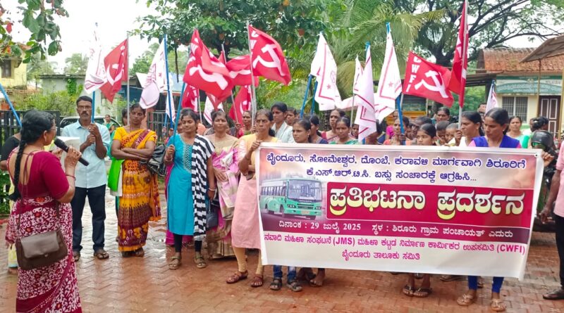 ಕುಂದಾಪುರ: ಕಟ್ಟಡ ಕಾರ್ಮಿಕರ ಮಹಿಳಾ ಉಪಸಮಿತಿ ಮತ್ತು ಜನವಾದಿ ಮಹಿಳಾ ಸಂಘಟನೆಯ ಸಹಯೋಗದಲ್ಲಿ ಬೈಂದೂರು ತಾಲೂಕಿನ ಗ್ರಾಮೀಣ ಪ್ರದೇಶಗಳಾದ ಬೈಂದೂರು, ಸೋಮೇಶ್ವರ,ದೊಂಬೆ, ಕರಾವಳಿ ಮಾರ್ಗವಾಗಿ ಶಿರೂರಿಗೆ ಸರಕಾರಿ ಬಸ್ಸು ವ್ಯವಸ್ಥೆ ಮಾಡಿ ಮಹಿಳೆಯರಿಗೆ, ವಿದ್ಯಾರ್ಥಿಗಳಿಗೆ ಸೌಲಭ್ಯಗಳನ್ನು ಒದಗಿಸಲು ಆಗ್ರಹಿಸಿ ಶಿರೂರು ಗ್ರಾಮ ಪಂಚಾಯತ್ ಎದುರು ಶಿರೂರು ನಾಗರಿಕರಿಂದ ಪ್ರತಿಭಟನೆ ನಡೆಯಿತು.